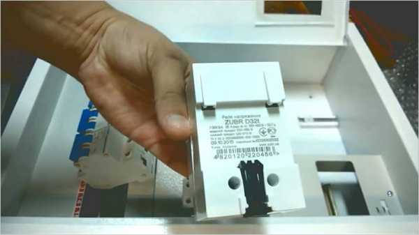 - После счетчика устанавливаем распределительную коробку с планкой под автоматы защиты, от которых и будет проводиться каждая кабельная линия. Перед распредкоробкой устанавливается УЗО, у которой входной провод всегда должен заводиться сверху, а выход на квартиру снизу. УЗО может быть одно на квартиру или несколько на разные группы электроприборов.