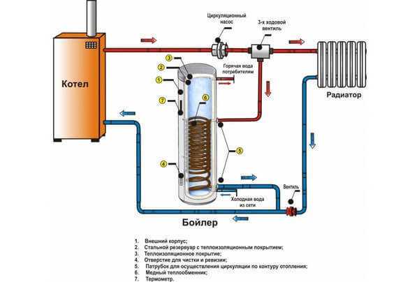 - Можно купить бойлер – специальный прибор, который подключается к отопительному котлу.