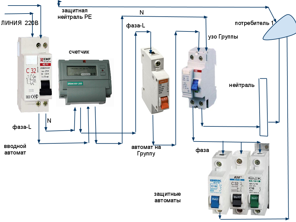- Подключают к внешней сети распределительный щит, устанавливают счетчик и автоматические выключатели до и после него.