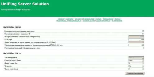 Настройки устройства UniPing server solution полностью совпадают с настройками устройства UniPing RS-485. На станице UDP-COM следует выбрать тип порта RS-485.