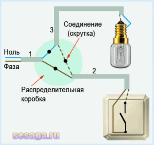 Рабочий ноль, выделенный синим цветом, подводится через распределительную коробку к ближнему контакту электрического патрона, внутрь которого вворачивается лампочка накаливания.