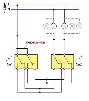 Для экономии можно установить внешнюю перемычку для второй секции выключателя, а не прокладывать два провода к первому выключателю.
