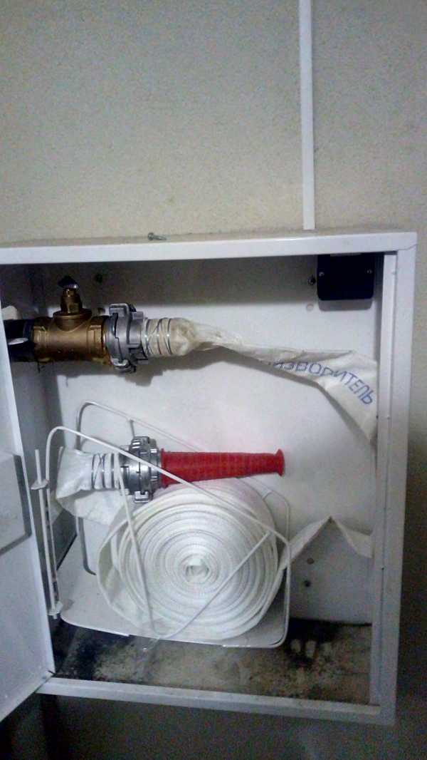 В каждом шкафу кроме самого крана со свёрнутым шлангом имеется кнопка пуска пожарного водопровода.