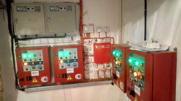 В самом углу небольшой красный ящичек — это и есть Поток-3Н, левее красные шкафы управления двумя электродвигателями пожарных задвижек. Они подключаются к Потоку параллельно и он считает, что командует одной задвижкой (так проще). Выше, серые такие — ШКП (шкафы контрольно-пусковые): каждый управляет одним насосом — один основным, другой резервным. Команды «Пуск»- «Стоп» приходят на все шкафы от Потока-3Н. При нажатии кнопки у гидранта или получении команды «Пуск» от БКИ через С2000-М, Поток даёт команду открыть задвижки, затем, дождавшись сигнала об их открытии, даёт команду запустить основной насос. Далее, ориентируясь по показаниям датчиков давления и движения воды в системе (т.н. «датчик протока»), он принимает решение о нормальной работе или аварии основного насоса. В случае аварии он даёт шкафу команду запустить резервный насос.