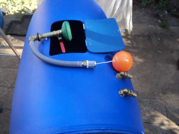 - 4 этап. Врезаем штуцер для заливки воды, если она подается автоматически через шланг. Делаем сверху отверстие для заливки воды вручную и чистки емкости. Последовательность вырезания такая же, как и для лейки. Штуцер устанавливается либо сверху, либо сбоку бака. Отверстие для очистки только на верней поверхности, оно должно быть достаточного размера, чтобы можно было прочищать емкость. На него из подсобных материалов нужно изготовить крышку. Это может быть небольшой лист тонкой оцинковки.
