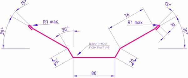 После монтажа профнастила на скаты крыши, на место их стыка устанавливается верхняя планка ендовы. Этот элемент выполняет больше декоративную функцию, закрывая края кровельного покрытия. На рисунке показано устройство ендовы из профнастила.