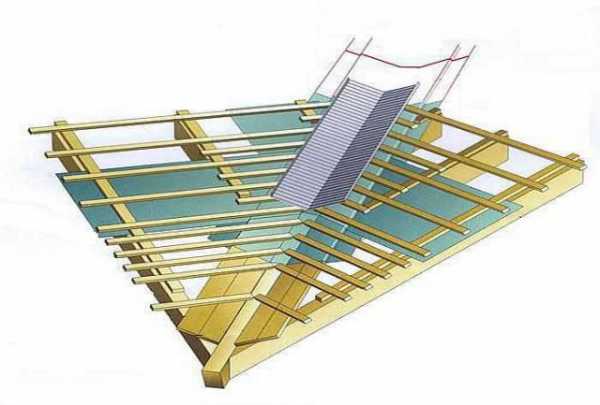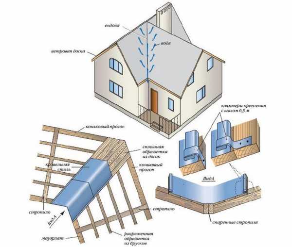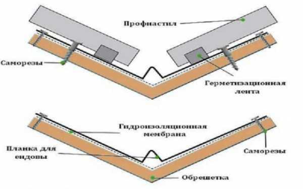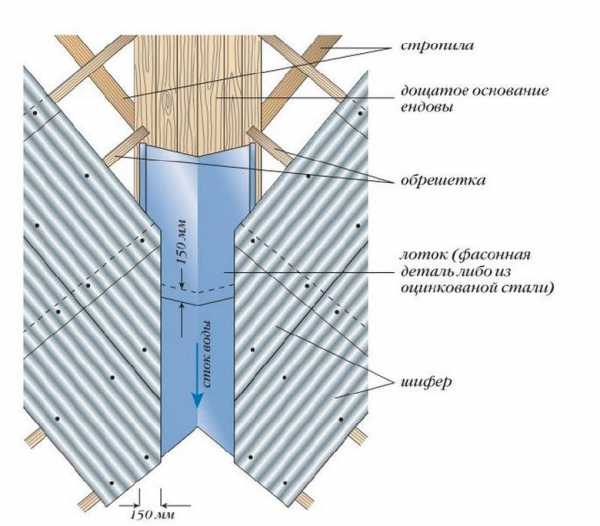 Из чего бы не строили крышу, какой бы не выбирали материал для кровли, есть общие правила укладки, схема устройства ендовы: