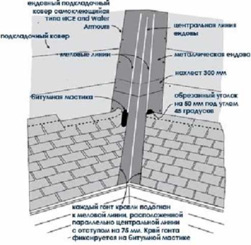 Последний способ называют закрытой разделкой. Суть его заключается в том, что края полотнищ или кромки гонтов перехлестывают друг на друга на осевой линии ендова. Предварительно под слой кровли на обрешетку крыши укладывается подкладочный ковер ендового узла. Он толще и прочнее обычной подкладки.