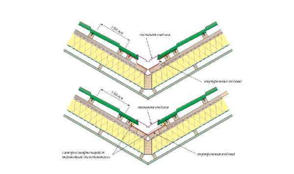 - Усиливающая обрешетка основания узла. Давление на ендовый угол очень большое, особенно, если учесть, что на относительно узком пространстве скапливается снежная масса одновременно с двух скатов;