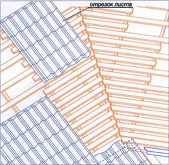4. Настил покрывают асбестоцементным (шиферным) лотком или лотком из оцинкованной стали. Это называют еще нижней ендовой. Край лотка должен выступать вперед, за границу деталей металлочерепицы, листов шифера или профнастила. Это обеспечит жесткость и надежность конструкции.
