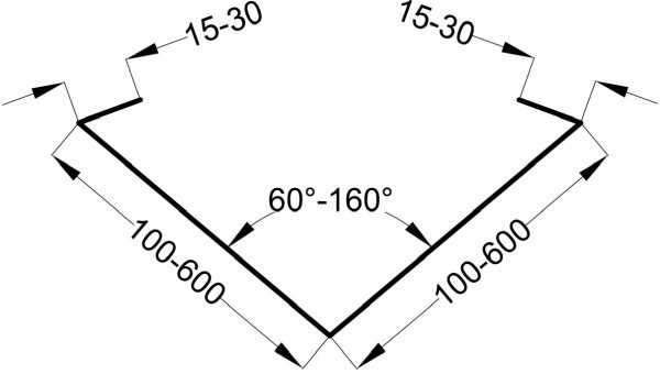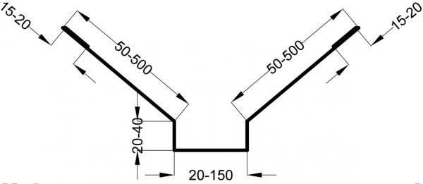 Размеры верхней ендовы выбираются в зависимости от конфигурации узла и расстояния. Для небольших крыш используются желоба с шириной боковой полки 106 мм и шириной центрального канала 30-40 мм. На высоких двухскатных крышах используется верхняя ендова с полкой в 145 мм и каналом 70-80 мм. Угол раскрытия составляет 135о.