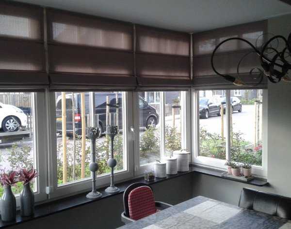Шторы следует выбирать в зависимости от назначения эркера. Если так получилось, что вид из окна не очень приятный, то закрыть его можно римской шторой, рулонными шторами, жалюзи. Также эти варианты прекрасно подойдут для оформления рабочего кабинета в эркере. Причем крепиться они могут на оконном профиле.