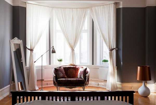 Если вы хотите подчеркнуть зону эркера, вам помогут этого добиться французские шторы.