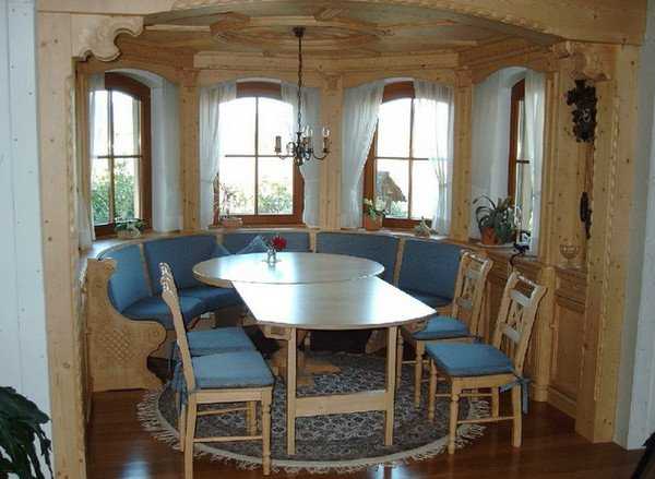 Возможно, вы сталкивались с ситуацией, когда гостей так много, что не хватает стульев и приходится просить соседей дополнительную мебель. А просторная лавочка или диванчик в эркере решит вопрос дополнительного места для сидения.