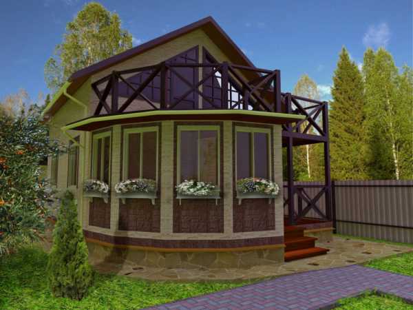 Среди наиболее популярных можно выделить проект двухэтажного дома с эркером и балконом. Выступ начинается от самого фундамента снаружи на первом этаже и плавно переходит на балкон второго этажа, который повторяет контуры эркера. Балкон в этом случае может быть просто огражден, крыт или остеклен.