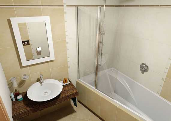 Π‘ΡΠ΅ΠΊΠ»ΡΠ½Π½Π°Ρ ΡΠ°ΠΊΠΎΠ²ΠΈΠ½Π° Π½Π΅ Π·Π°Π³ΡΠΎΠΌΠΎΠΆΠ΄Π°Π΅Ρ ΠΏΡΠΎΡΡΡΠ°Π½ΡΡΠ²ΠΎ. ΠΠ°ΠΆΠ΅ ΠΌΠ°Π»ΠΎΠ³Π°Π±Π°ΡΠΈΡΠ½Π°Ρ Π²Π°Π½Π½Π°Ρ ΠΊΠΎΠΌΠ½Π°ΡΠ° Π²ΡΠ³Π»ΡΠ΄ΠΈΡ ΠΏΡΠΎΡΡΠΎΡΠ½ΠΎΠΉ