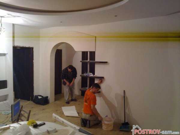 - После выполнения этих работ стены и потолок необходимо выровнять. Если предполагается установка натяжных потолков, выравнивание потолка обычно не делают.