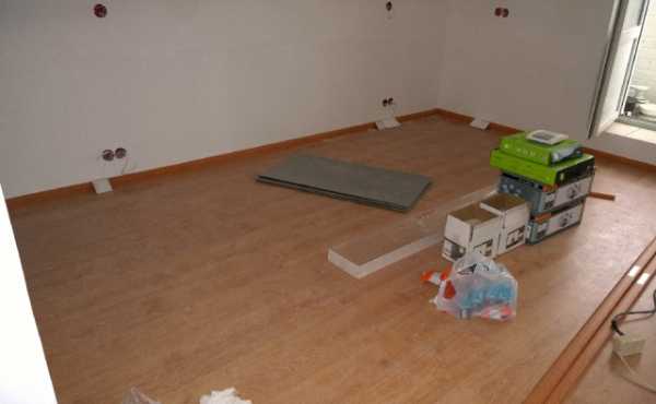 Как только стены и потолок оказываются готовыми к чистовой отделке — покраске или оклейке обоями, можно начать ремонт пола. Чаще всего на бетоне укладывается ламинат или паркетная плита, но можно собрать и настоящий деревянный пол. Напольное покрытие грунтуется, сушится и накрывается пленкой.