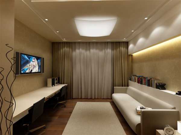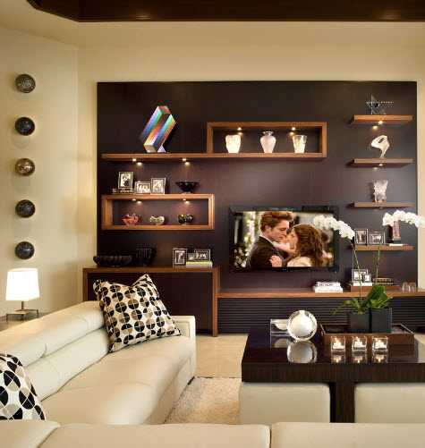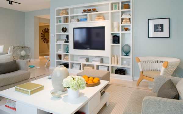 В такой комнате есть возможность удобно разместить любимые и книги или диски на полках вокруг домашнего кинотеатра. На столе — ваза со свежими цветами, всегда благоухающими и источающими приятный ненавязчивый аромат. Светлые тона здесь нисколько не делают интерьер холодным, а даже в некоторой степени придают уюта.