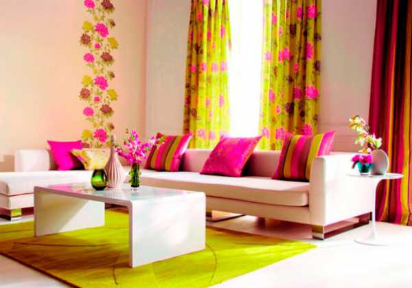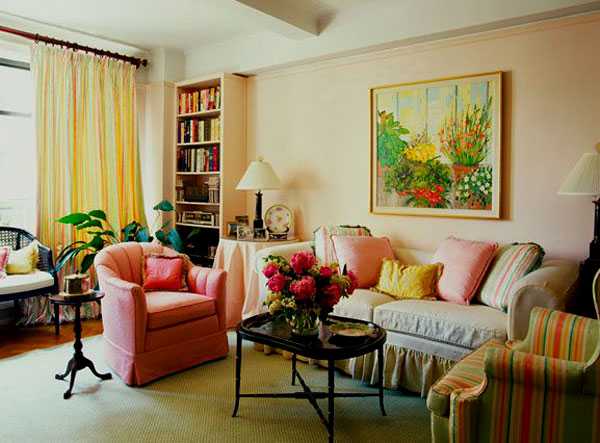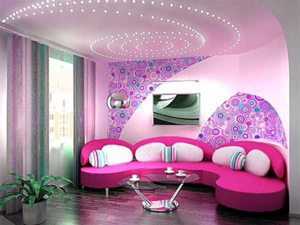 Преобладание пестрого цвета (в данном случае розового) сделает атмосферу легкой и непринужденной. Такой дизайн подходит для людей веселого темперамента, ведь здорово посидеть здесь вечером за чашечкой кофе и обсудить все новости, произошедшие за день.