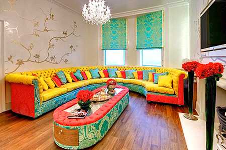 Немного небрежности и дизайнерское оформление комнаты готово. Широкий и просторный зал интересно заполнен диванами и пуфиками, где можно как полистать модный журнал, так и просто посидеть и послушать музыку.