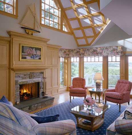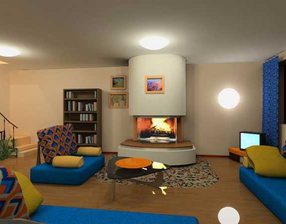 При виде этой фотографии хочется закричать «Уют!» Потому что камин уже в некоторой степени свидетельствует об атмосферной обстановке, а остальные элементы дизайна выгодно дополняют общую идею. И даже кажущийся многим холодным синий становится теплее благодаря необычным подушкам приятной расцветки.