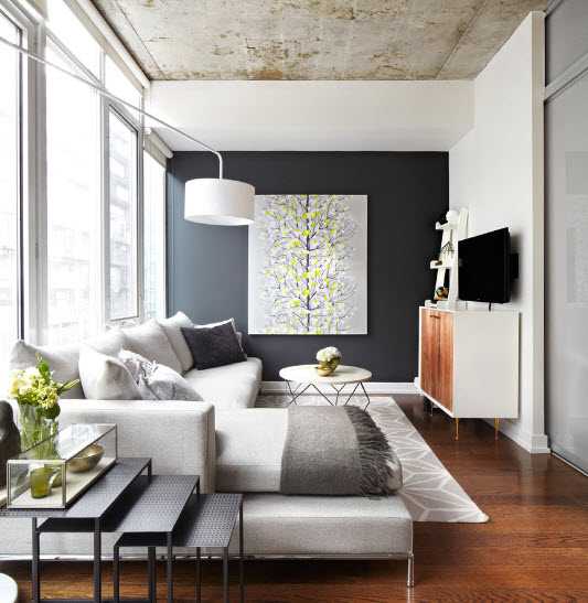 Такое оформление выглядит весьма строго, но в такой комнате всегда будет присутствовать чувство свежести и свободы. Данного типа ремонт подойдет для комнат с красивой панорамой из окна.