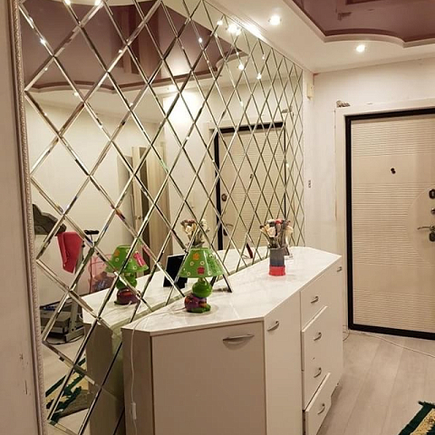 На фото стена, украшенная большим зеркалом с фацетом в виде ромбов.