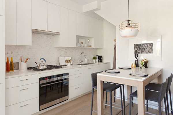 Хотя некоторые дизайнеры предпочитают использовать отделку на всю площадь стены, чаще фартук выделяется из общей композиции и выступает яркой деталью — с помощью цвета, фактуры или рисунка. Можно приобрести такое же покрытие, как у столешницы — это поможет гармонизировать пространство.