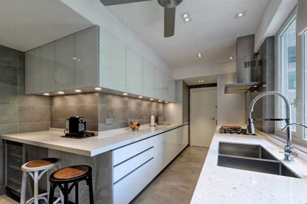 Желательно, чтобы фартук на кухне захватывал не только область приготовления пищи, но и все пространство между верхними и нижними шкафами – по всему пристенному периметру мебели.