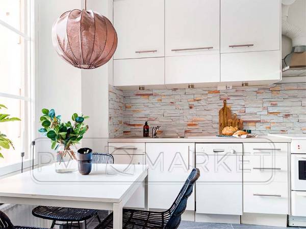 - Фартук для кухни из пластика может иметь и различные фактурные разновидности. Прекрасно смотрится на фото деревенских интерьеров фартук «под дерево» или имитирующий каменную кладку. Для белой классической кухни отличным решением будут также светлые тона, но с интересными «волнами» или выпуклым узором.