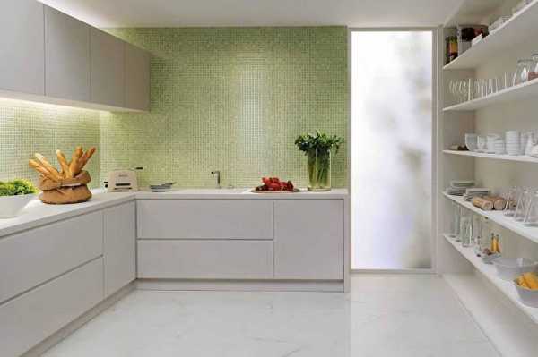 Зеленая мозаика — освежит любую кухню и вдохнет в нее жизнь. Для обустройства такого кухонного фартука можно использовать стекло либо керамику. Ярко-зеленая поверхность отлично впишется в современные стили интерьера — минимализм или хай-тек.