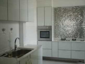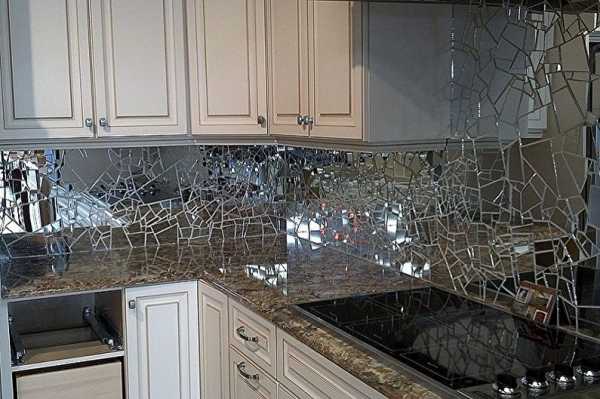 - Зеркальная мозаика. Фартук формируется из зеркальных элементов прямоугольной или квадратной формы. Полотно радует блеском и броской фактурой. Фартук очень износоустойчив и достаточно прочный. К недостаткам относят необходимость частого ухода и сложностей в чистке рабочей поверхности.