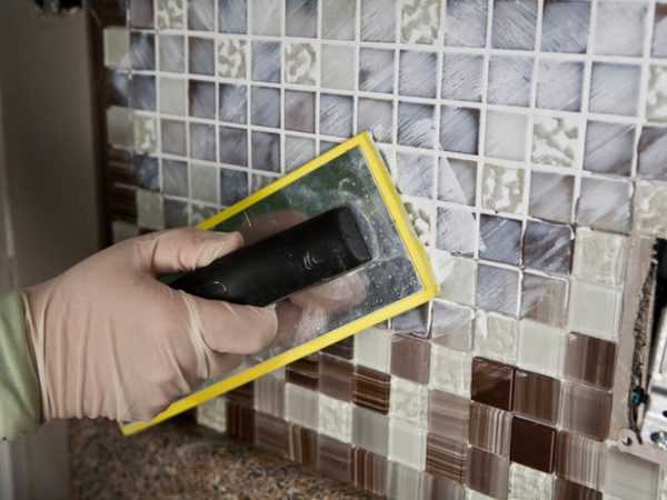 Затирка на фартук из мозаики на кухню наносится как минимум через сутки, когда клей надежно схватится. Затирочную смесь наносят резиновым шпателем, выжидают 30-60 минут (пока она начнет схватываться, но еще не высохнет окончательно), после стирают ее с поверхности плитки влажной губкой.
