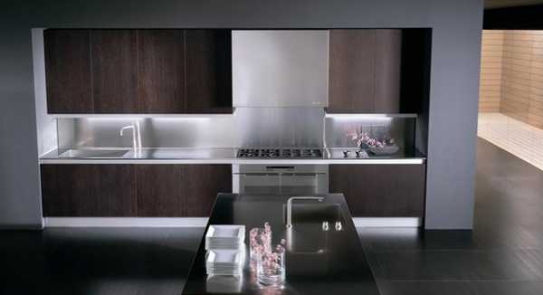 Главный минус такой отделки заключается в ее холодном внешнем виде, да и возможных цветов совсем мало. Важно очень хорошо продумать интерьер кухни, чтобы такой фартук смотрелся действительно органично и стильно. Более того, материал этот очень хорошо отражает свет, поэтому продумать нужно и систему освещения, чтобы не получить помещение с обилием бликов и солнечных зайчиков.