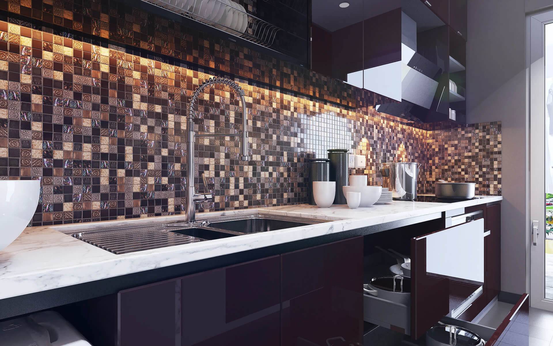 - кухонный фартук лучше делать без рельефов, поскольку с поверхности будет тяжело удалять пыль, жир и другую грязь;