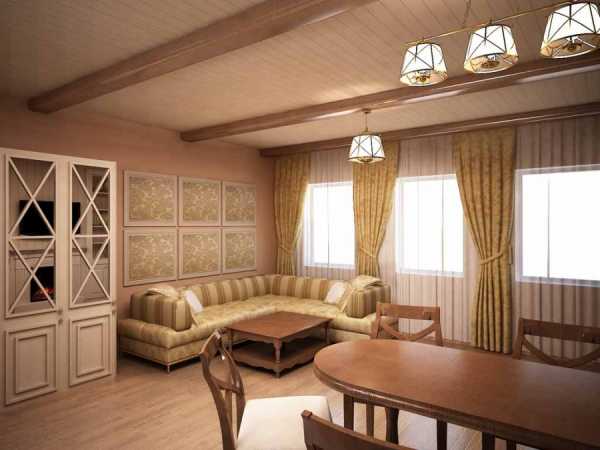 Деревянные балки на потолке не прячу под перекрытием, а оставляют на виду. У них свое декоративное предназначение. Их окрашивают в черный, коричневый, терракотовый цвет или же просто покрывают антигрибковой пропиткой и сохраняют структуру дерева.