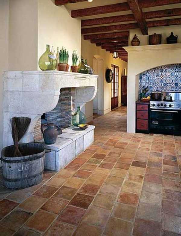 Раньше в качестве полового покрытия выбирался натуральный камень терракотовых оттенков. Но стоит такое удовольствие очень дорого, потому сегодня камень заменяют керамической плиткой. При выборе материала ориентируются на: