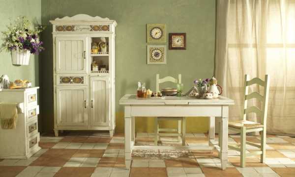 А можно поступить проще: выделить один открытый шкаф, в котором и будет размещён весь декор – от небольших часов до декоративных ваз. Такой шкаф станет декором-акцентом и изюминкой кухни стиля прованс. Наполнить его можно по своему усмотрению.