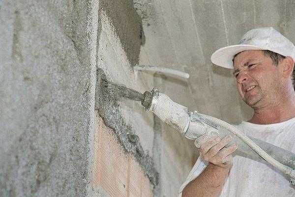 - Если площадь стен большая, то для ускорения и облегчения работ можно применить штукатурную машину. Подается раствор через сопло. Участок с нанесенным раствором снова выравнивается правилом.