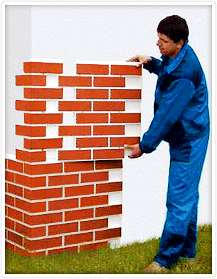 Начинайте кладку от нижних углов стены вверх. В целом процесс аналогичен установке плит на обрешетку.