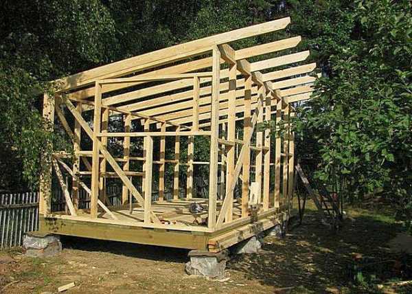 При строительстве здания по каркасному принципу стойки с одной стороны сразу же делаются выше – для обеспечения уклона стропил.