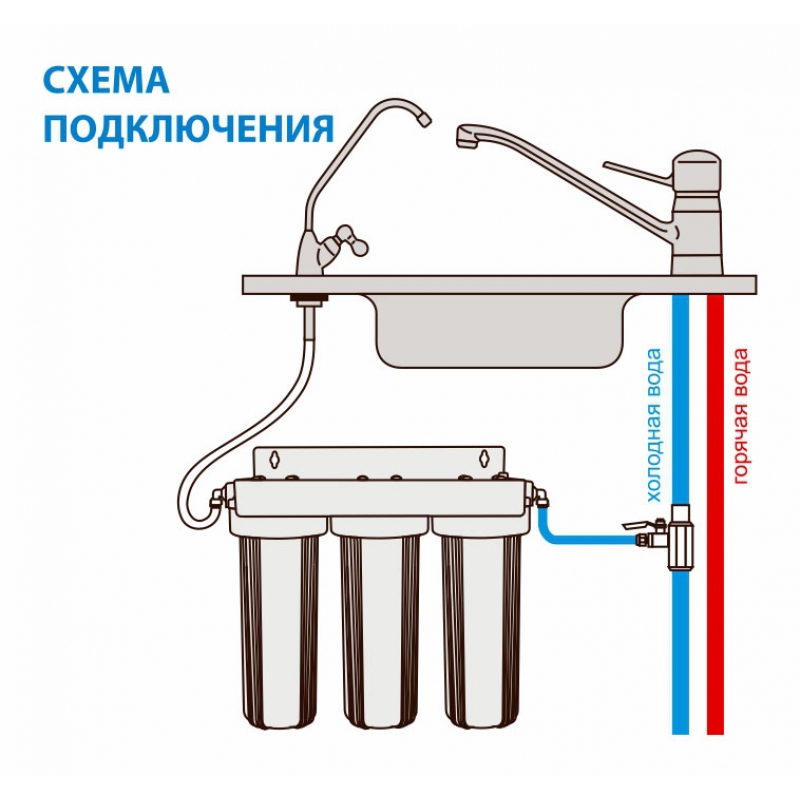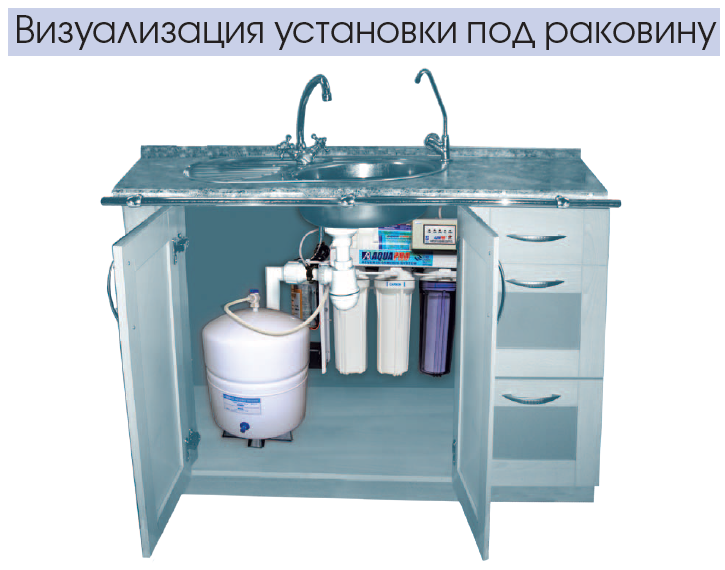 01os), которая успешно монтируется под мойку. Фильтрующие элементы устанавливают под нее, а наружу выводится кран с чистой водой, пригодной для питья. Нужно учесть, что кран будет врезаться в мойку, в которой придется проделать отверстие, так как отверстие для крана питьевой воды заводом-изготовителем не предусмотрено.