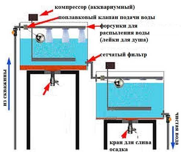 Фильтры для очистки воды из скважины — это эффективное, но далеко не дешевое оборудование. Решить проблему можно проще: при помощи аэрации. Дело в том, что в воде присутствует железо в двух формах: растворенная двухвалентная форма и выпадающая в осадок трехвалентная. Принцип аэрации основан на добавление в воду кислорода, который окисляет двухвалентное железо, растворенное в воде до трехвалентного, которое и выпадает в осадок в виде ржавого осадка. Кроме ржавчины этот метод нейтрализует марганец, сероводород (дает запах тухлых яиц), аммиак.