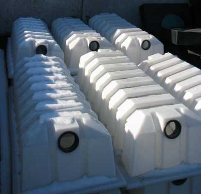 Заводские инфильтрационные блоки имеют вместимость от двухсот литров. Но иногда требуется гораздо больший объем. Чтобы получить необходимую «мощность», несколько небольших инфильтраторов для септиков объединяют с помощью патрубков. Когда первый из них переполняется, вода по переливу начинает поступать в следующий бак и дренируется уже там.