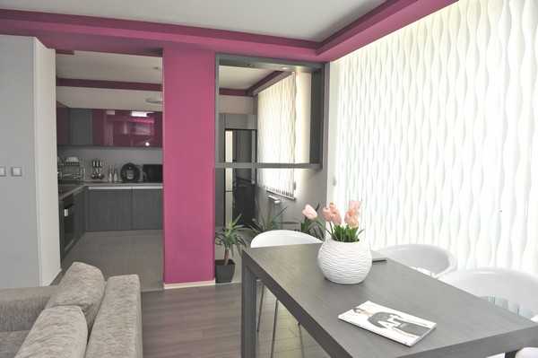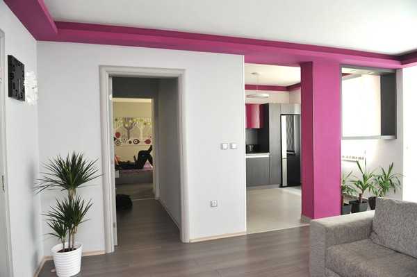 Цвет фуксии и серый цвет в интерьере кухни
