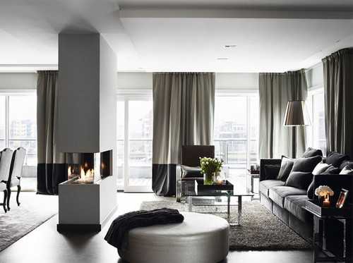 Серые шторы в интерьере используются как органичное продолжение серых стен. Конечно же, в этом случае нужно использовать различные оттенки серого, например, шторы сделать чуть светлее, чем стены или использовать серые шторы с рисунком, повторяющим цвет мебели или пола.