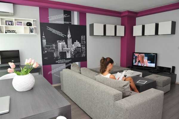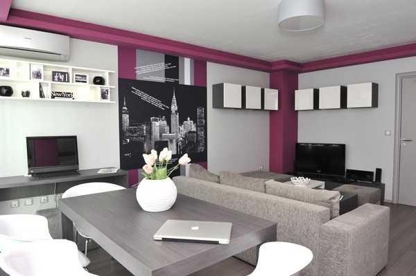 Интерьер гостиной в серых тонах хорошо бы разбавить благородным фиолетовым, бордовым или сиреневым цветом. Также для контраста можно использовать желтый, белый, салатовый, оранжевый, голубой цвета.