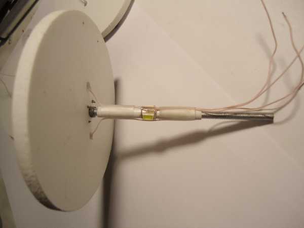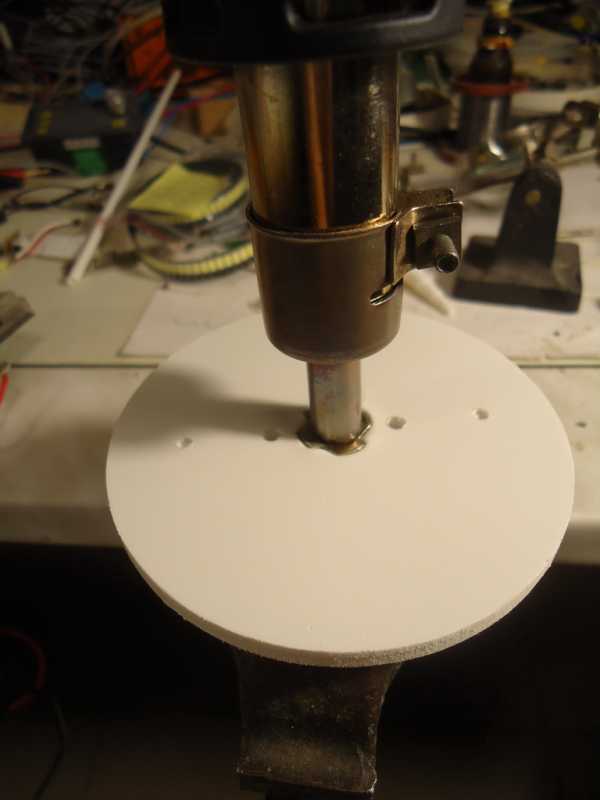 При помощи паяльного фена в центр вплавляется мебельная гайка М4: