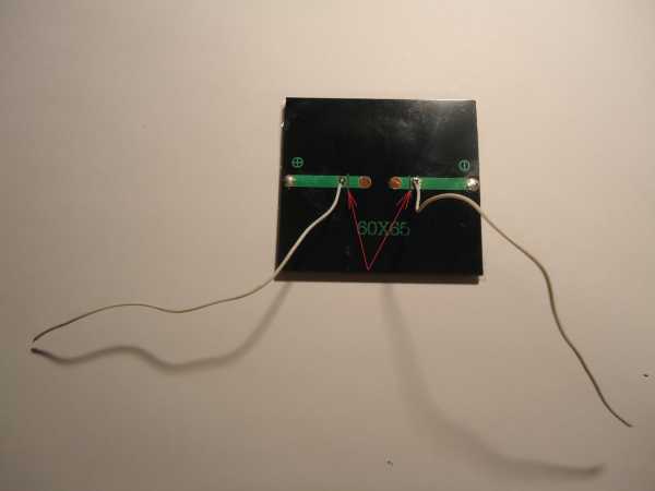 К солнечной батарее припаиваются провода. Для того чтобы исключить возможность короткого замыкания солнечной панели мебельной гайкой, дорожки сразу за точками пайки перерезаются: